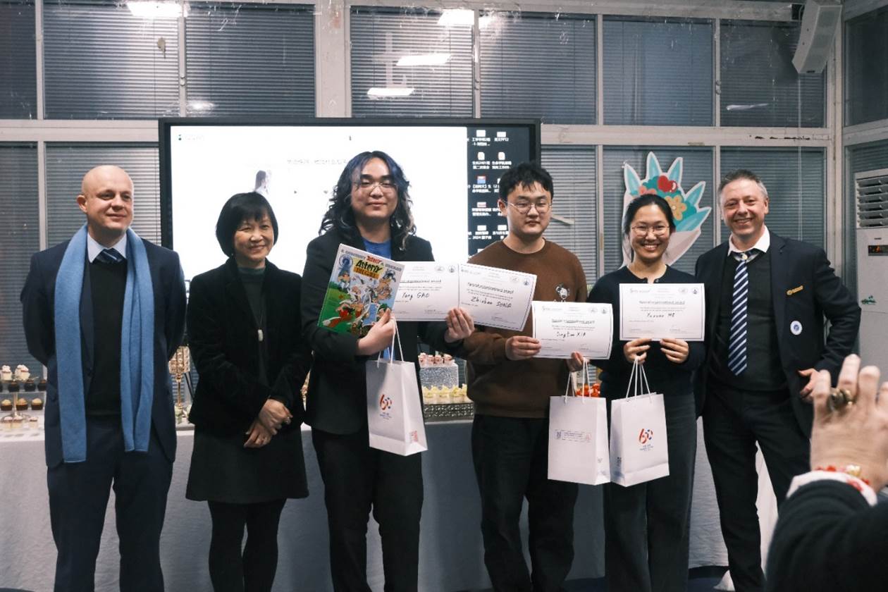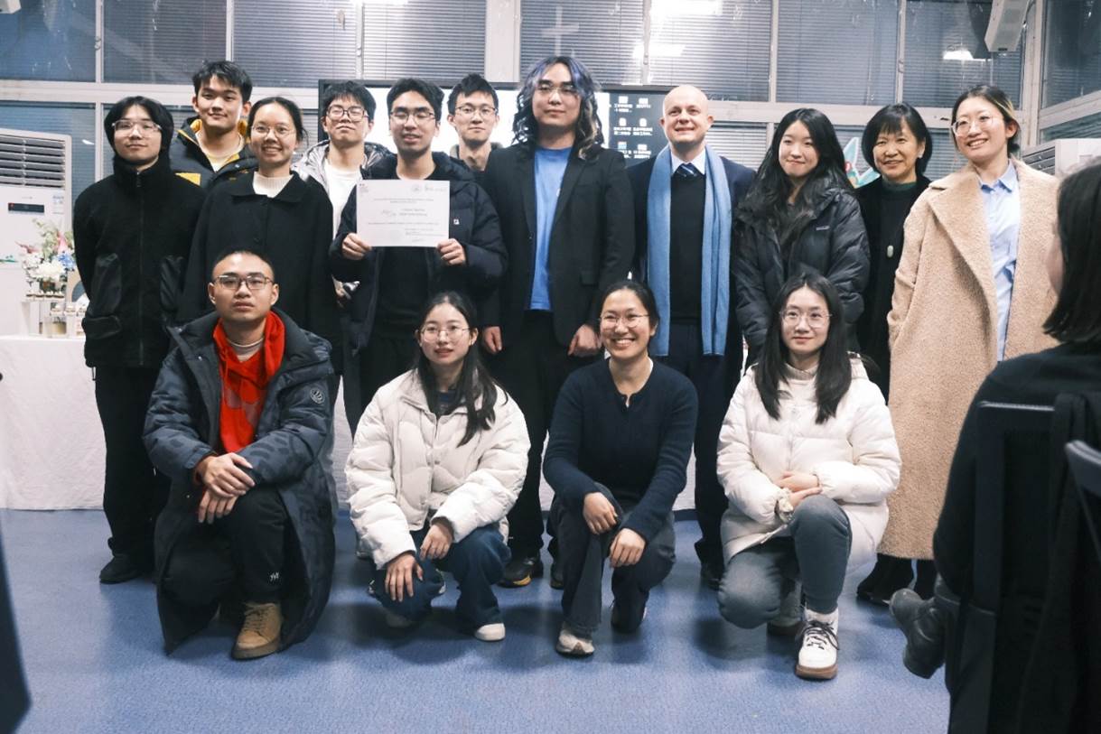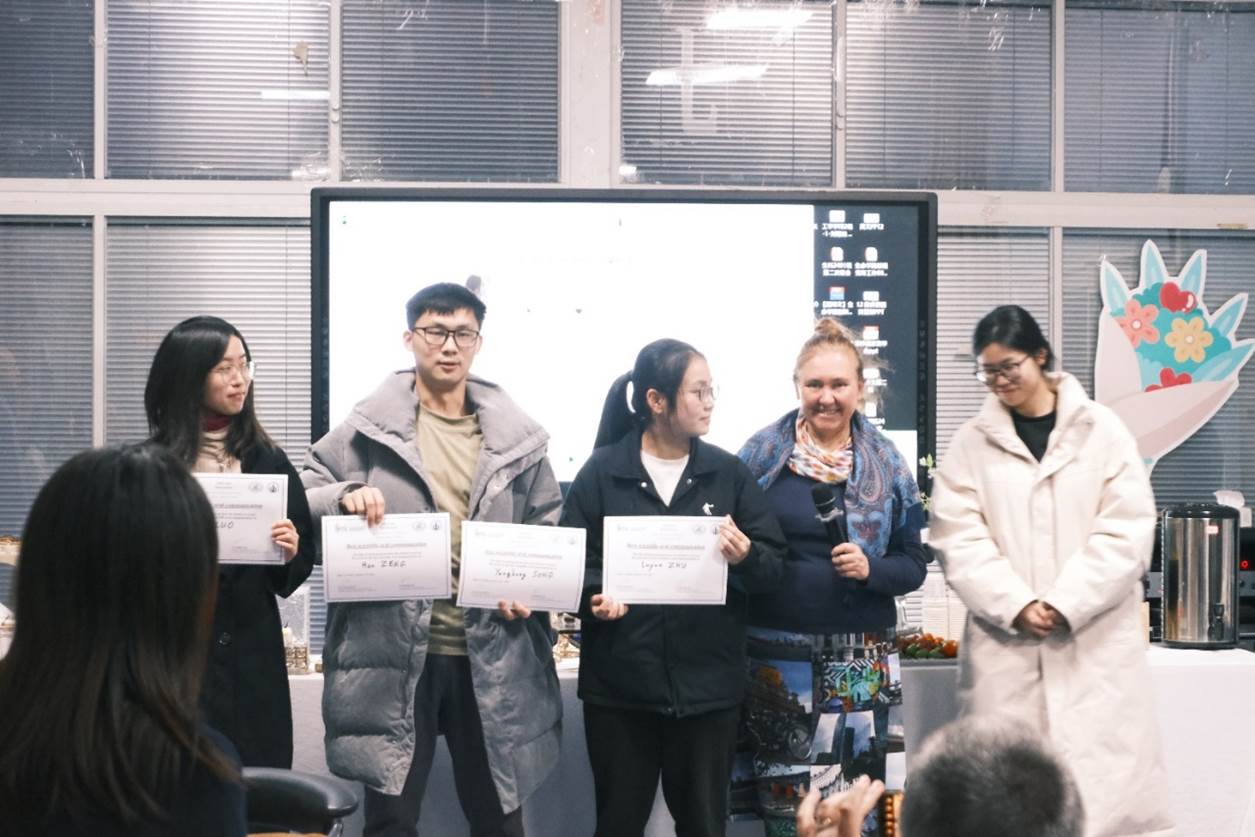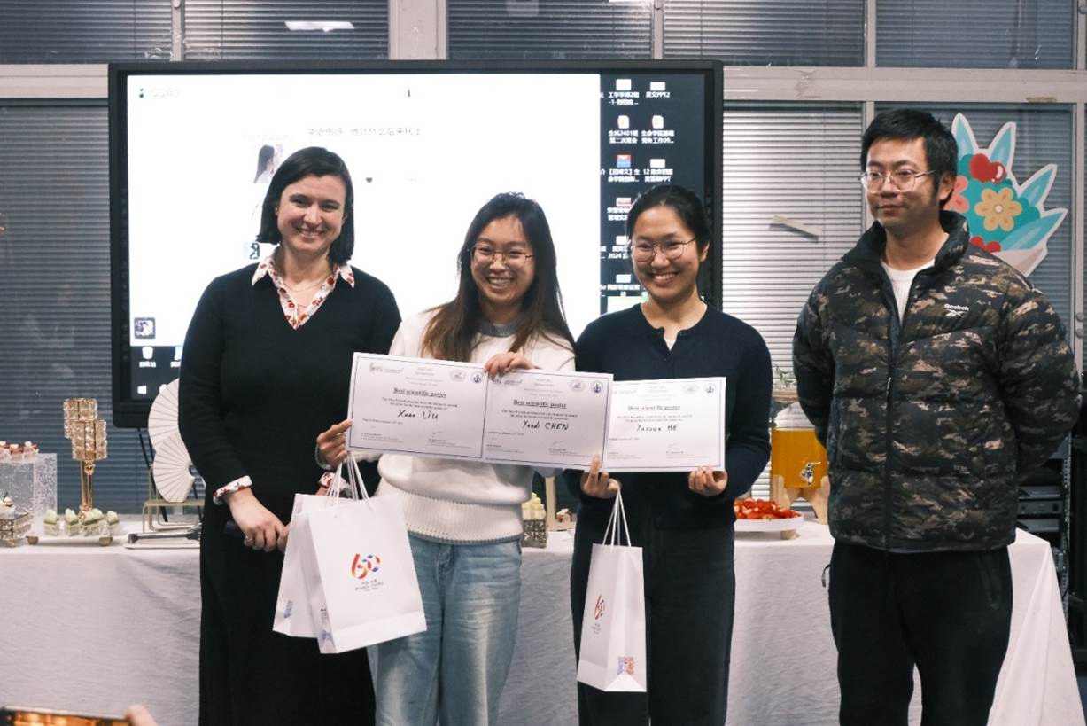 交流汇报结束后进行了颁奖典礼。本次会议评选出“最佳海报奖”、“最佳演讲奖”以及“最佳组织奖”。B组同学刘镟、何雨萱、陈芸笛的“stem cell therapy on treating hair loss”主题海报获得了“最佳海报奖”;D组的骆徳莉、宋阳弘、曾涵、朱鹭云凭借“heat-and-drought-resistant transgenic fruits and vegetables”的主题演讲获得“最佳演讲奖”;高旸、何雨萱、宋祉善、夏锦添获得了“最佳组织奖”。法国领馆还为中法联队HUST-UEVE-UPSaclay 2023年iGEM银奖项目Algal Chip以及2024年 iGEM金奖项目Aqua Guardian^2 颁发了荣誉证书,以表彰同学们在国际竞赛中取得的成绩以及中法高校学术交流的优秀成果,鼓励同学们再创佳绩。颁奖典礼结束后,同学们与嘉宾亲密互动、展示才艺。