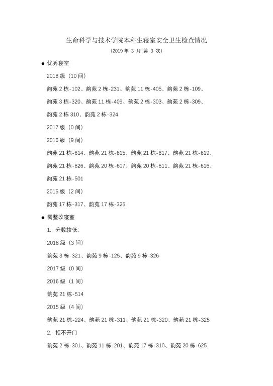 3月31日,学院学生会生活权益部组织开展了对全院500余间本科生寝室的安全卫生检查工作(每两周开展一次),检查结果如下,感谢全院同学对寝室检查工作的配合与支持,让我们共同营造更为安全、温馨的寝室氛围。