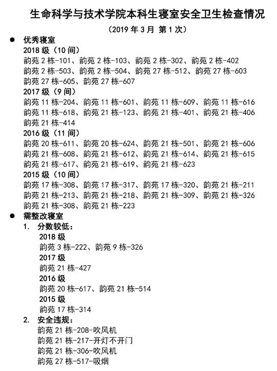 3月3日,学院学生会生活权益部组织开展了对全院500余间本科生寝室的安全卫生检查工作(每两周开展一次),检查结果如下,感谢全院同学对寝室检查工作的配合与支持,让我们共同营造更为安全、温馨的寝室氛围。