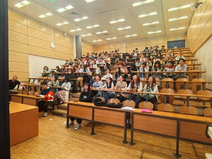 That night, the teachers and students of Sacré Coeur University held a wine and cheese lecture and tasting event for our Chinese-French family. French wine and cheese culture are significant symbols of their diet and lifestyle, deeply rooted in daily social interactions and traditions. Wine is not only a drink but also an integral part of French meals. Whether it's a family dinner or a casual gathering with friends, pairing wine with food is a common practice, which has also given rise to a professional wine-tasting culture, including the appreciation of wine's aroma, taste, and aftertaste. The students successively tasted white wine, champagne, and red wine, enhancing their understanding of French wine culture. There are hundreds of types of French cheese, and at this lecture, the students sampled soft Camembert, rich Roquefort blue cheese, and hard Comté cheese, among others. Each type has its unique production process and flavor, often related to local milk and traditional techniques.
