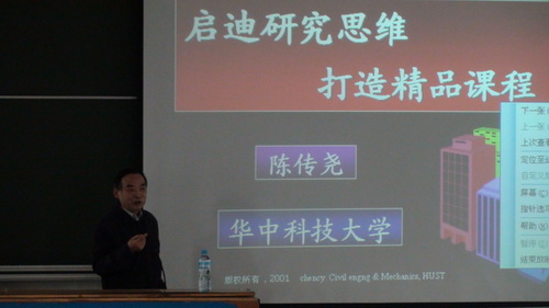 国家级教学名师、原土木学院院长陈传饶教授给大家带来了“启迪研究思维,打造精品课程”的报告。报告中,他以自身的教学经验向大家阐述了教学理念与教师的责任,启迪研究思维的基本思考,注重归纳思维,全过程多方位启迪研究思维和打造精品课程的基本思路。他着重强调了多媒体教学的重要作用,号召各位老师能够多用并善用多媒体把抽象的知识呈现给广大同学们。