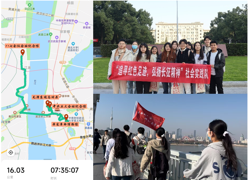 湖北是中国工农红军的重要诞生地和土地革命战争的重要根据地,为长征的胜利作出了重要贡献,在长征精神的铸就过程中发挥了重要作用。实践队结合五史学习教育内容精心策划实践路线,自辛亥革命博物院起,至八七会议会址终,途径毛泽东旧居纪念馆、中共五大会址纪念馆,全程16公里,以徒步的方式进行。一路行走一路体验,一路收获一路成长,实践队成员追寻着红色足迹,体悟革命先辈的坚韧与勇气,对中华民族的奋斗历程和先辈们的伟大贡献有了更加深刻的理解。
