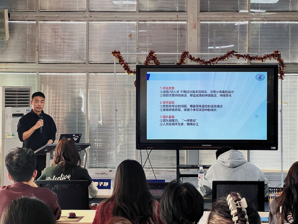 “青创+”朋辈辅导团讲师、“挑战杯”全国特等奖项目负责人、材料学院 2023 级博士研究生侯明君,创新性提出一要构建可视化故事线,用3D建模呈现技术原理;二要设计对比实验矩阵,用数据差异增强说服力;三要创设应用情景剧,让评委看见技术温度。从“如何讲好作品”出发,为同学们提供了丰富且全面的竞赛经验。