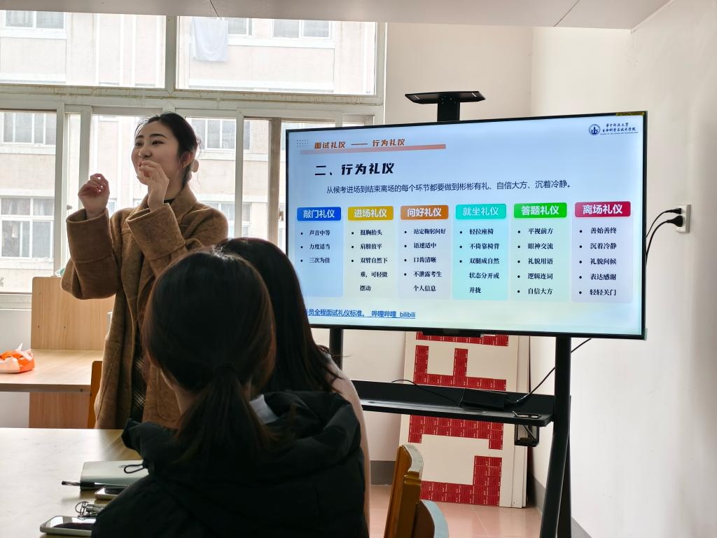 任鑫琦为同学们带来了精彩的面试技巧讲解。她着重讲解了面试礼仪,从着装礼仪、行为礼仪、回答礼仪等方面进行了详细指导,并结合自身经验,分享了面试中的一些“加分项”和“雷区”,提醒同学们要保持自信、沉着冷静,展现出自己的最佳状态。