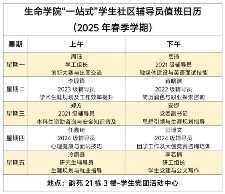 无论你是初入校园的 "萌新小白",还是深耕学术的 "科研达人",亦或是冲刺就业的 "职场预备役",都能在这里找到专属成长方案。每周一至周五,导师们将化身 "社区合伙人",与你共话成长故事。记得提前查看以下值班日历,预约专属成长对话!让我们在玉兰树下的社区空间,共同书写属于你的青春蜕变故事!