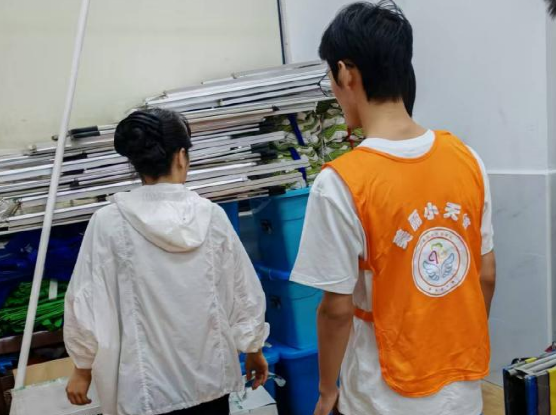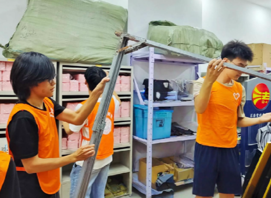 烈日当空,暑气蒸腾,却难掩青春热忱。同学们分组投入清扫工作:搬运组将散落各处的桌椅归整成列,清扫组清理楼道积尘与卫生死角,收纳组将杂乱的标识牌、床帘等物品分类叠放,同学们穿梭于社区中,认真清理社区每个角落。