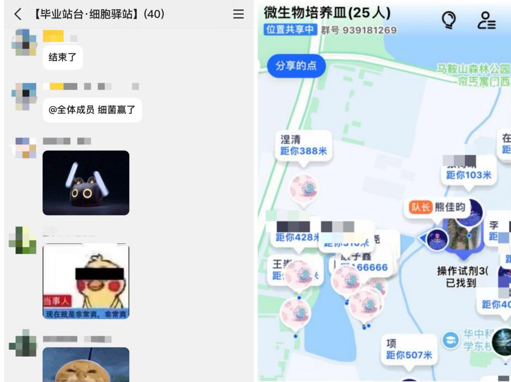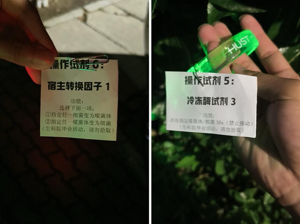 作为生命学院2025年毕业季系列活动的线下第一站,该活动改编自“猫捉老鼠”高德地图实时定位游戏,将其融入生物学元素,改编为细菌和噬菌体之间的追逐与逃脱,同学们分别带上红色(代表噬菌体)和蓝色(代表细菌)荧光手环,还有散布在校园各处的绿色(代表道具卡)荧光手环,是一场轻松有趣的户外活动。活动开始前负责人详细向大家介绍游戏规则,并在强调在野外跑步追逐的过程中注意安全。参与活动的30余名同学自主分为“噬菌体”和“细菌”两个阵营,游戏地图为整个东校区,使用高德地图实时定位进行游戏。