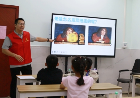 紧接着,陈俊威教授带来了“细胞的发现”及水熊虫的奇妙故事。陈教授用形象生动的语言讲述了细胞发现的历程,从人类第一次观察到细胞,到如今对细胞世界的深入研究,带领孩子们走进了微观世界的神奇殿堂。课堂上,孩子们踊跃举手提问,“熊虫它这么小,怎么会有这么强的生命力呢?”问题一个接一个,陈教授耐心地一一解答,课堂气氛活跃到了极点,孩子们对生命科学的兴趣被彻底激发出来。