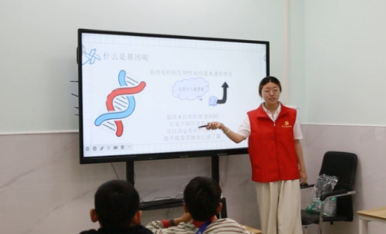 硕士生刘羲则围绕“遗传性状”,通过一个个有趣的案例,引导孩子们了解遗传的奥秘。孩子们立刻来了兴趣,纷纷讨论起来。“我和爸爸有一样的酒窝!”“我妈妈的眼睛和我一样大!”他们争相分享自己的发现,脸上洋溢着兴奋的笑容。在交流中,孩子们的思维不断碰撞出火花,对遗传知识有了更深刻的理解。