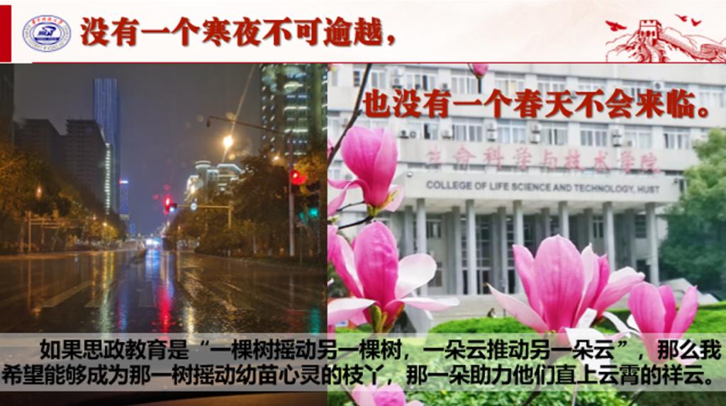 虽然我不是冲在战疫一线的医务工作者,但习近平总书记的那句“你们是光明的使者,希望的使者,是最美的天使,是真正的英雄”也成为我们在思政育人岗位上追求的目标。因为,医者治身,师者筑心,如果思政教育是一棵树摇动另一棵树,一朵云推动另一朵云,那么我希望我能够成为那一树摇动幼苗心灵的枝丫,那一朵助力他们直上云霄的祥云。