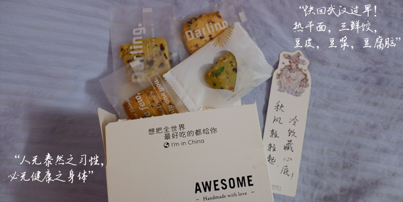 拆开包装,里面是一盒包装精美、新鲜出炉的手工蔓越莓饼干,还附有一张手写着祝福语或健康提示的小卡片——“人无泰然之习性,必无健康之身体”、“快回武汉过早!热干面,三鲜饺,豆皮豆浆豆腐脑”……