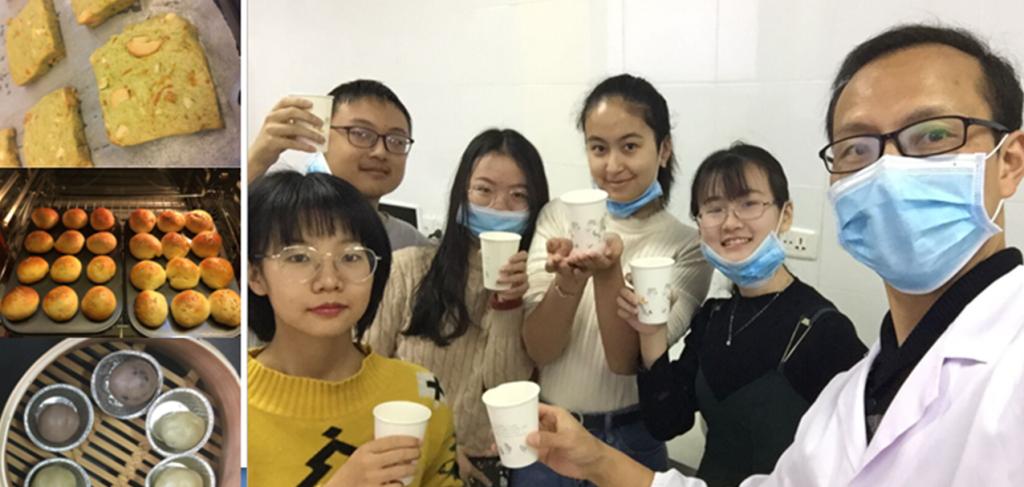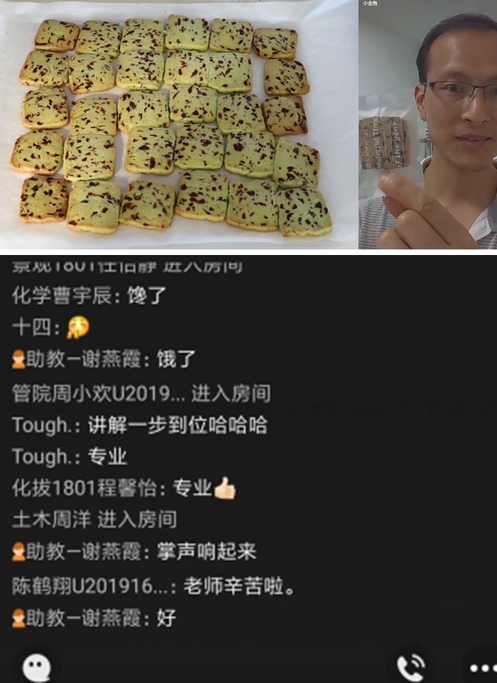 为了减少接触风险,我独自待在学院东十二楼5楼实验室的食品制作间,开始了美食互动直播课的准备工作。清洁消毒房间、封上空调和地漏出口、找来管钳修好了水管漏水、网上查询着各种愿意向武汉发货的食品原料、搭起了双机位直播平台……直播那天,看着黄油软化、糖粉撒下,原料混合-成型-冷冻-切块-烘烤,首批蔓越莓饼干顺利出炉,当我拿着一枚包装好的小饼干在屏幕前展示时,同学们纷纷呼唤“老师快递来,到付”……