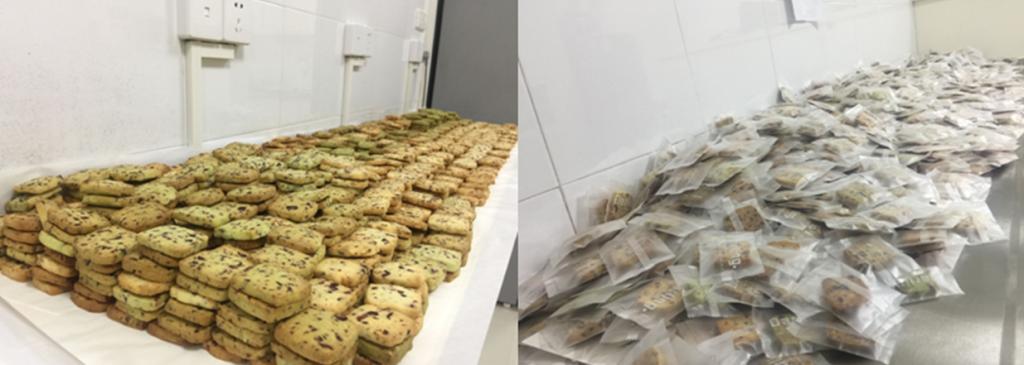 27日,批量原料终于全部到货;28日,饼干冷冻成型;29日,两台大烤箱连续烘烤了16个小时,1120块饼干终于可以开始包装。这几天,我把自己关在实验室,到了夜里,整栋东十二教学楼内的房间,只有521室这一盏灯光。