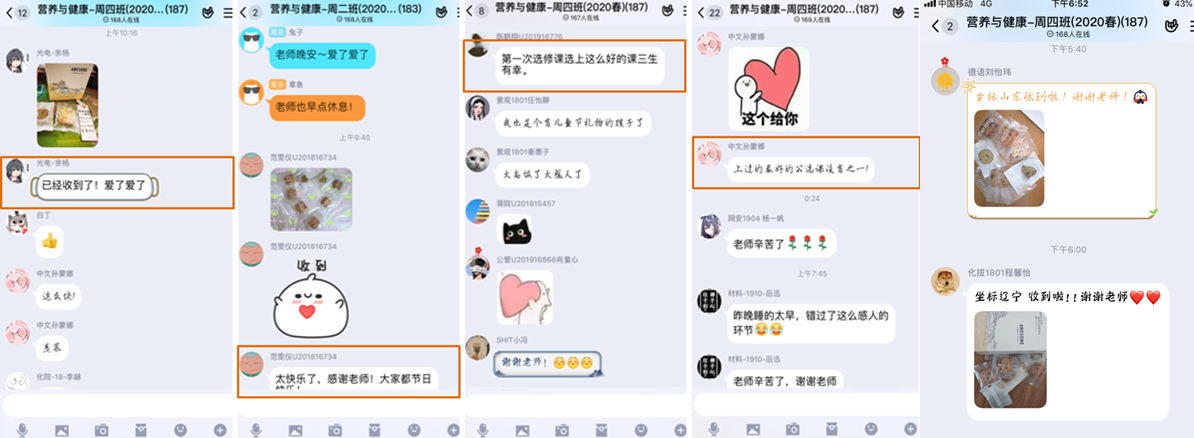 这140盒共1120枚自制饼干的发货地都是武汉市williamhill英国,发件人就是我,这些学生都是选修了我校今年春季的全校公选课《营养与健康》,而我是主讲人之一。6月1日上午11点开始,我的手机就不停滴滴的响着,收到小饼干的同学在我们的课程qq群上表达着收到小饼干的激动和感动——“虽然同学们分隔各地,但此时心被老师连在了一起”、“不安的等待变成了暖暖的期待,期待着早日在武汉团聚”、“送给奶奶品尝了,奶奶说很好吃”,还有的在朋友圈晒出饼干,“感谢1037号森林里可爱的老师为我们亲手制作的饼干,它让2020年变得更加温暖。”更多的同学则用汇报坐标的方式在群上接龙,而这时候我才发现班里的同学刚巧遍布全国大江南北,东至江浙沿海,西至新疆,南至海南,北至黑龙江。