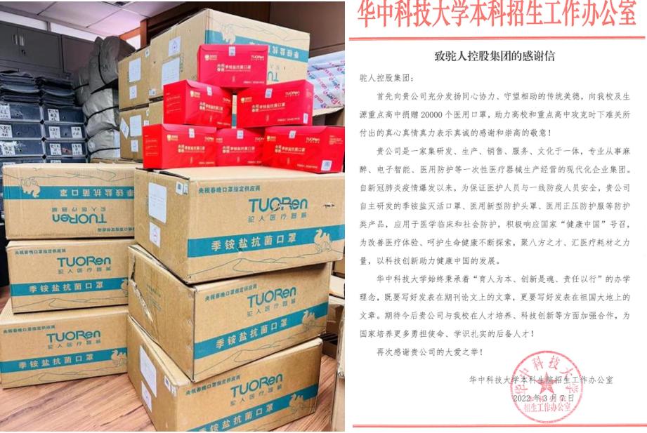 凝聚企业正能量,众志成城抗疫情。2022年3月7日,生命学院校友企业驼人控股集团向williamhill英国及生源重点高中捐赠的2万个医用口罩顺利运抵,为学校和生源重点高中攻克疫情防控难关提供了大力支持!