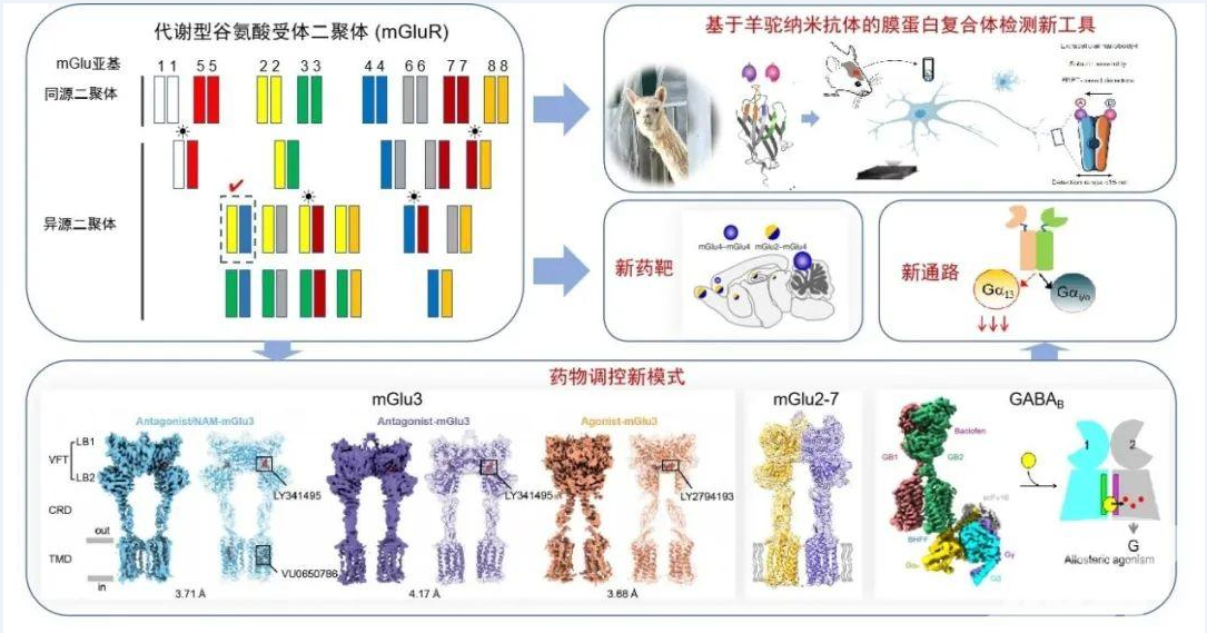 G蛋白偶联受体(GPCR)是重要的药物靶点。刘剑峰团队针对以GPCR复合体为单元的信号整合新机制开展了研究,发现了大脑中新的GPCR二聚体复合体新靶点和非对称激活机制,阐明了GPCR二聚体药物调控新模式,并发现了靶向GPCR二聚体新信号通路和新功能,攻克了内源性GPCR复合体研究的技术瓶颈,提出了药物开发新策略。