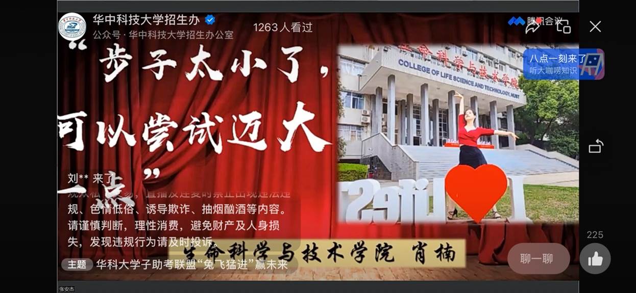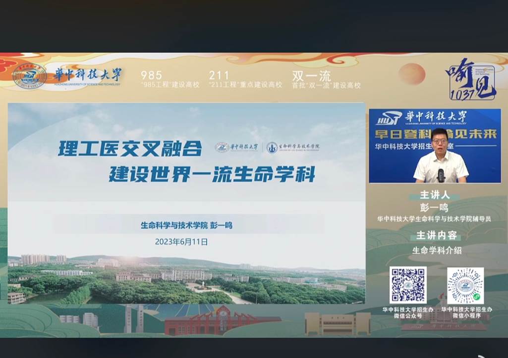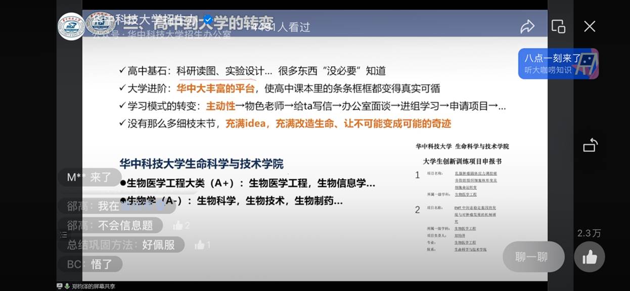 1月10日,2020级生物信息学专业本科生肖楠作为分享嘉宾参加“2023华科大学子助考联盟”直播,为高中学生分享大学成长经历