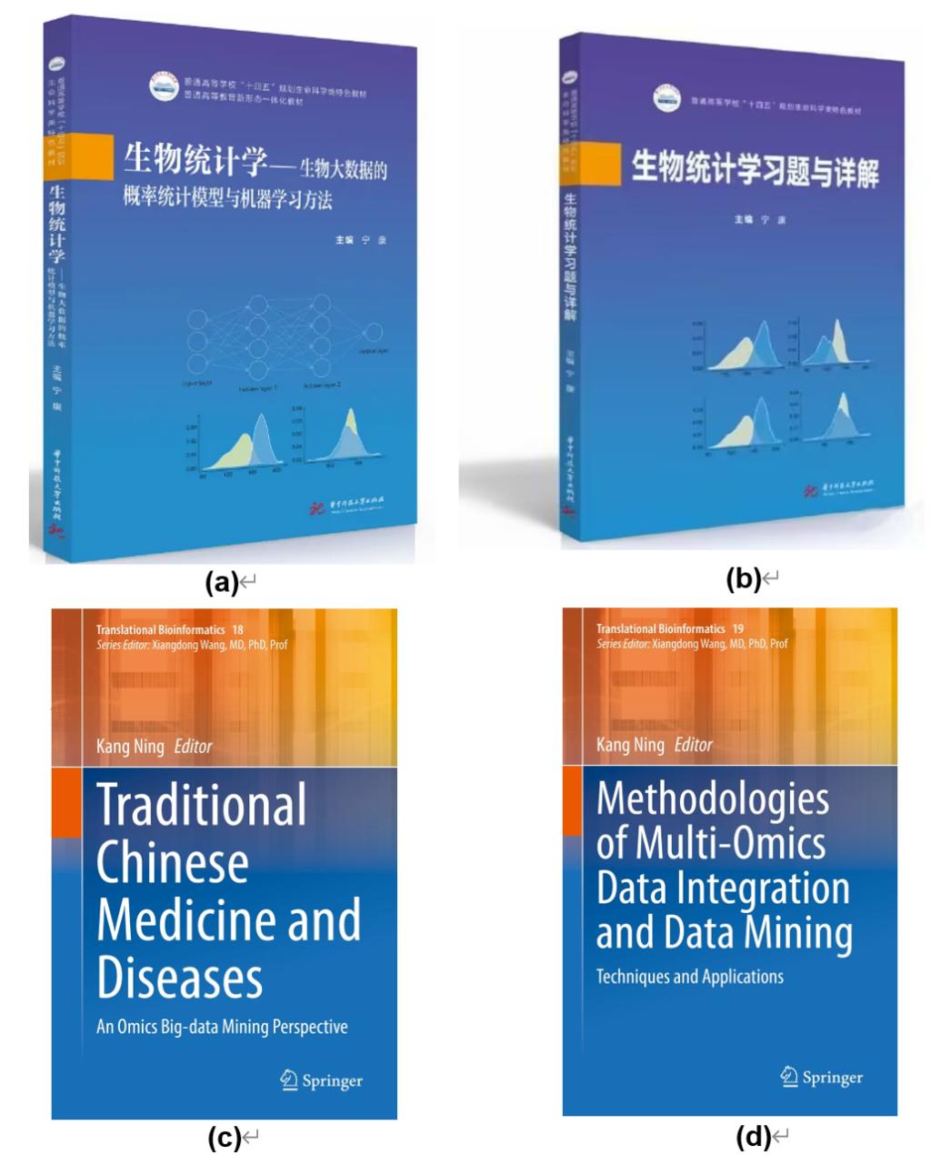 图2. 已出版的系列教材《生物统计学:生物大数据的概率统计模型与机器学习方法》(a)、《生物统计学习题集》(b)、《Traditional Chinese Medicine and diseases: An omics big-data mining perspective》(c)和《Methodologies of Multi-Omics Data Integration and Data Mining》(d)封面。