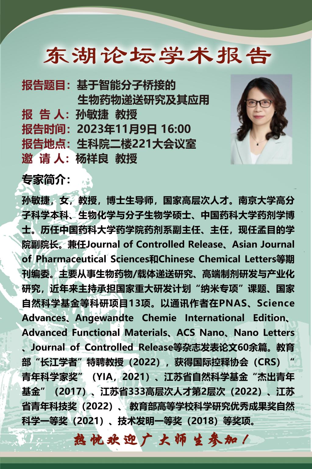 孙敏捷,女,教授,博士生导师,国家高层次人才。南京大学高分子科学本科、生物化学与分子生物学硕士、中国药科大学药剂学博士。历任中国药科大学药学院药剂系副主任、主任,现任孟目的学院副院长。兼任Journal of Controlled Release、Asian Journaof pharmaceutical Sciences和Chinese Chemical Letters等期刊编委。主要从事生物药物/载体递送研究、高端制剂研发与产业化研究,近年来主持承担国家重大研发计划“纳米专项”课题、国家自然科学基金等科研项目13项。以通讯作者在PNAS、ScienceAdvances、Angewandte Chemie International EditionAdvanced Functional Materials、ACS Nano、Nano LettersJournal of Controlled Release等杂志发表论文60余篇。教育部“长江学者”特聘教授 (2022),获得国际控释协会 (CRS)“青年科学家奖” (YIA,2021)、江苏省自然科学基金“杰出青年基金” (2017)、江苏省333高层次人才第2层次 (2022)、江苏省青年科技奖(2022)、教育部高等学校科学研究优秀成果奖自然科学一等奖 (2021)、技术发明一等奖 (2018) 等奖项。