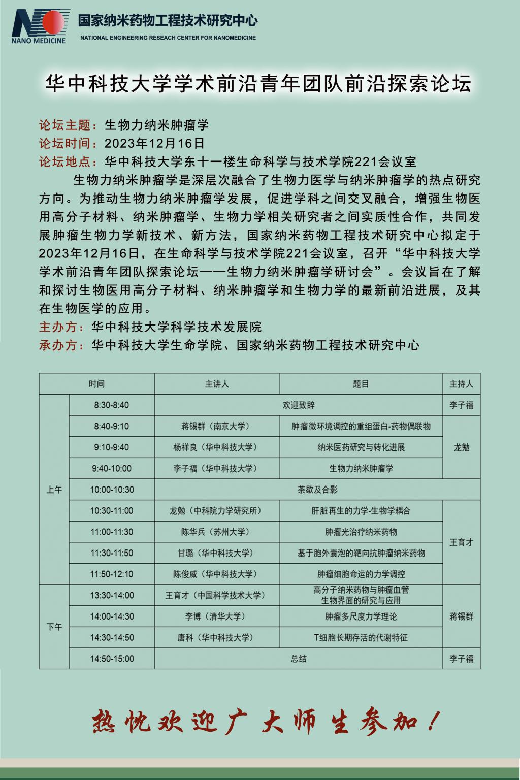 生物力纳米肿瘤学是深层次融合了生物力医学与纳米肿瘤学的热点研究方向。为推动生物力纳米肿瘤学发展,促进学科之间交叉融合,增强生物医用高分子材料、纳米肿瘤学、生物力学相关研究者之间实质性合作,共同发展肿瘤生物力学新技术、新方法,国家纳米药物工程技术研究中心拟定于2023年12月16日,在william威廉英国221会议室,召开“williamhill英国学术前沿青年团队探索论坛——生物力纳米肿瘤学研讨会”。会议旨在了解和探讨生物医用高分子材料、纳米肿瘤学和生物力学的最新前沿进展,及其在生物医学的应用。欢迎感兴趣的老师及同学参会!