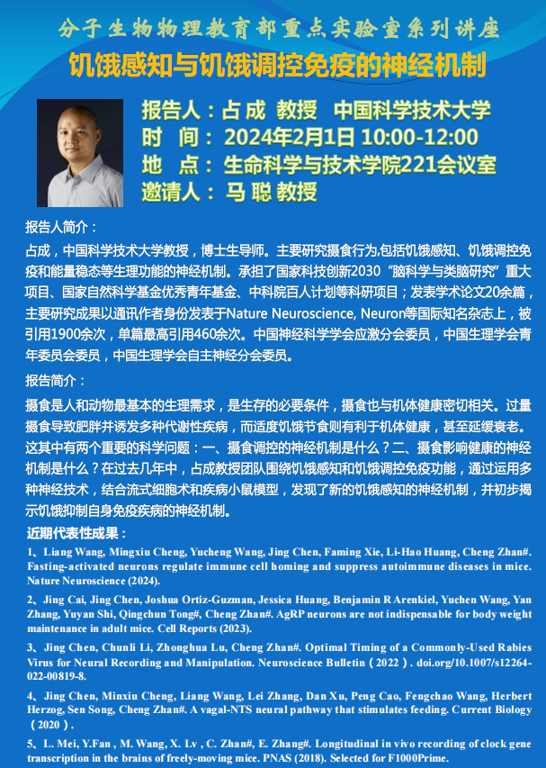 报告简介:摄食是人和动物最基本的生理需求,是生存的必要条件,摄食也与机体健康密切相关。过量摄食导致肥胖并诱发多种代谢性疾病,而适度饥饿节食则有利于机体健康,甚至延缓衰老。这其中有两个重要的科学问题:一、摄食调控的神经机制是什么?二、摄食影响健康的神经机制是什么?在过去几年中,占成教授团队围绕饥饿感知和饥饿调控免疫功能,通过运用多种神经技术,结合流式细胞术和疾病小鼠模型,发现了新的饥饿感知的神经机制,并初步揭示饥饿抑制自身免疫疾病的神经机制。