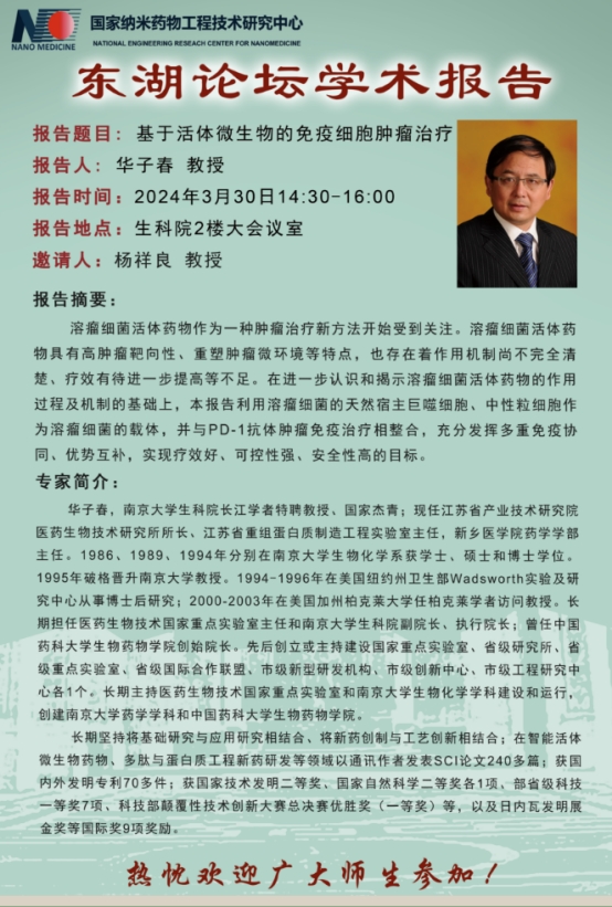 报告摘要:    溶瘤细菌活体药物作为一种肿瘤治疗新方法开始受到关注。溶瘤细菌活体药物具有高肿瘤靶向性、重塑肿瘤微环境等特点,也存在着作用机制尚不完全清楚、疗效有待进一步提高等不足。在进一步认识和揭示溶瘤细菌活体药物的作用过程及机制的基础上,本报告利用溶瘤细菌的天然宿主巨噬细胞、中性粒细胞作为溶瘤细菌的载体,并与PD-1抗体肿瘤免疫治疗相整合,充分发挥多重免疫协同、优势互补,实现疗效好、可控性强、安全性高的目标。 专家简介:    华子春,南京大学生科院长江学者特聘教授、国家杰青;现任江苏省产业技术研究院医药生物技术研究所所长、江苏省重组蛋白质制造工程实验室主任,新乡医学院药学学部主任。1986、1989、1994年分别在南京大学生物化学系获学士、硕士和博士学位。1995年破格晋升南京大学教授。1994-1996年在美国纽约州卫生部Wadsworth实验及研究中心从事博士后研究;2000-2003年在美国加州柏克莱大学任柏克莱学者访问教授。长期担任医药生物技术国家重点实验室主任和南京大学生科院副院长、执行院长;曾任中国药科大学生物药物学院创始院长。先后创立或主持建设国家重点实验室、省级研究所、省级重点实验室、省级国际合作联盟、市级新型研发机构、市级创新中心、市级工程研究中心各1个。长期主持医药生物技术国家重点实验室和南京大学生物化学学科建设和运行,创建南京大学药学学科和中国药科大学生物药物学院。    长期坚持将基础研究与应用研究相结合、将新药创制与工艺创新相结合;在智能活体微生物药物、多肽与蛋白质工程新药研发等领域以通讯作者发表SCI论文240多篇;获国内外发明专利70多件;获国家技术发明二等奖、国家自然科学二等奖各1项、部省级科技一等奖7项、科技部颠覆性技术创新大赛总决赛优胜奖(一等奖)等,以及日内瓦发明展金奖等国际奖9项奖励。