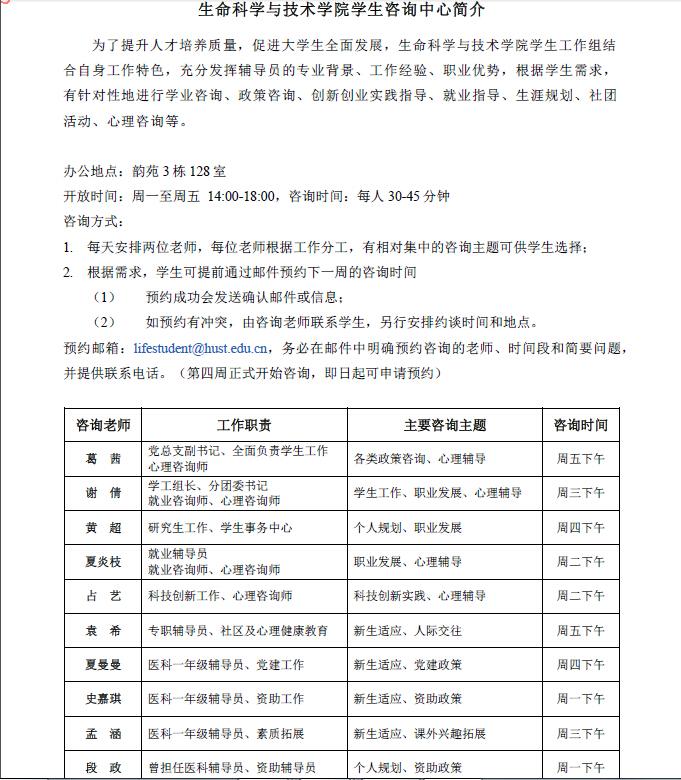 为保证咨询效率并便于辅导员协调工作,生命学院学工组10名成员根据工作职责以及个人特色分为五组,周一至周五下午轮流值班接受咨询。咨询主要采取预约制,学生可提前通过邮件预约咨询时间。预约邮箱:lifestudent@hust.edu.cn(务必在邮件中明确预约咨询的老师、时间段和简要问题,并提供联系电话)。预约成功后学生会收到确认邮件或短信,若某一时段咨询对象较集中,学工组将根据咨询对象情况另行协调时间地点进行咨询服务。