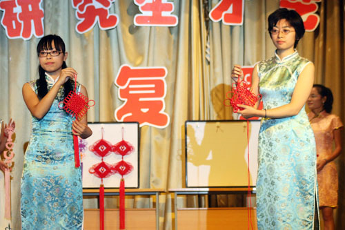 绳缘结韵组合带来的《心有千千结》节目,带领大家回归自然,穿越钢筋水泥的现在丛林,品味中国结艺中所蕴含的深切的祝福与厚重的文化。在悠扬古朴的笛箫合曲中,邱爽和王利肖同学为现场的观众展示了最传统的中国结——盘长结的制作过程。流畅的编织、娴熟的抽线、精细的整型,台上的姑娘们用她们的蕙质兰心和心灵手巧博得了现场观众的阵阵掌声和喝彩。