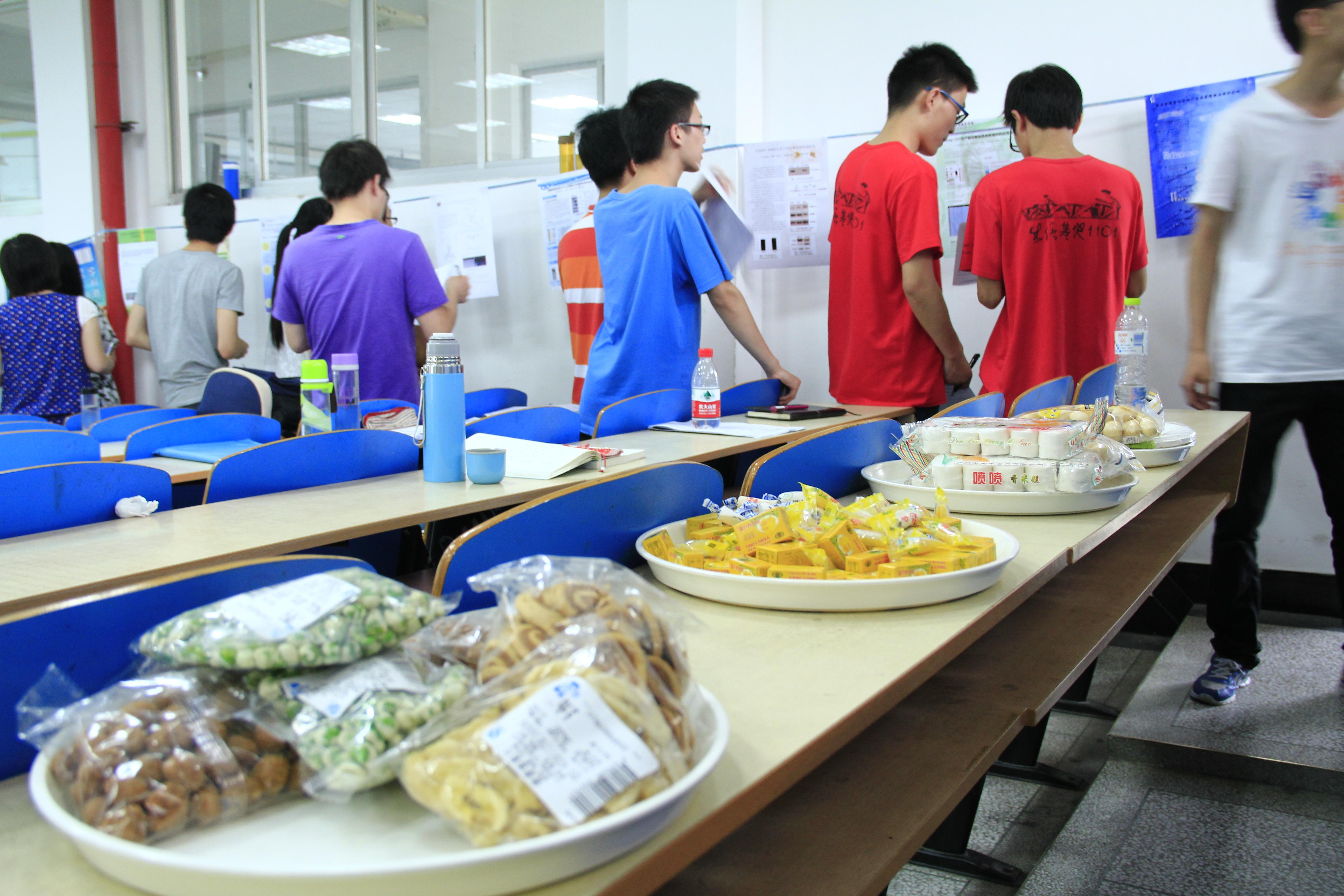 答辩会现场学生认真答辩 答辩会茶歇,中期检查学术海报观摩评
