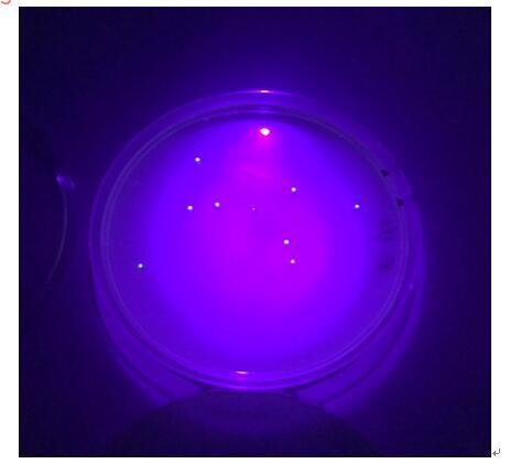 我们第一个实验是观察昨天转化的培养基平板,经过一个晚上的时间,培养基上长出了一些菌落,而每个小组都得到了预期的实验结果,细菌表达了GFP,在紫外光下发出了漂亮的荧光。