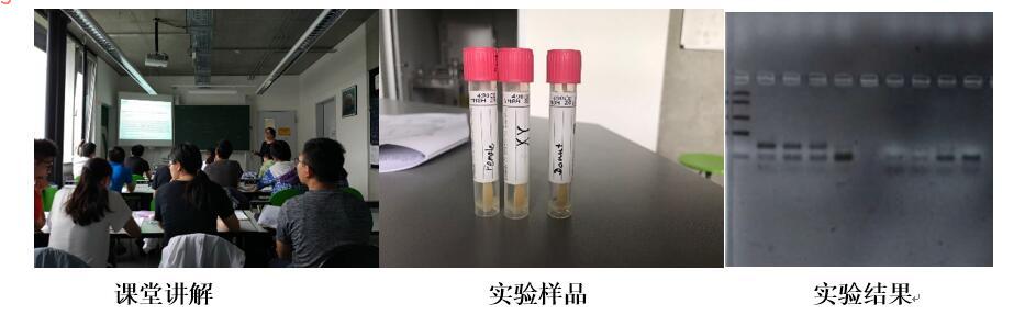 临吃午饭之前,老师一脸严肃的说大家到教室来还有一件事情要说,大家都很奇怪,因为黑板上写着“谁动了我的甜甜圈?”。老师开始跟大家描述事情的经过,早餐的时候她买了一个甜甜圈,准备要吃的时候来了一个电话,于是老师出去接电话,10分钟后回来发现甜甜圈被咬了一口,需要大家来当侦探,帮助老师破获这起“盗窃案”,由于今天的主题是PCR,大家很快就想到可以利用甜甜圈上的口水痕迹来收集小偷的DNA样品,通过PCR扩增来进行鉴定。来时又给了10分钟内的监控,发现只有两个可疑的人(两位助教,一男一女),通过老师给出的信息,我们在午饭时间讨论了侦破案件的方法。最终决定利用Y染色体上的特定基因作为鉴定的目的基因,利用X染色体上的基因作为对照,进行PCR扩增。通过之前肉类鉴定的实验,我们很快就确定了实验方案,并收集了疑犯的唾液样品作为阳性对照。然后开始破案!