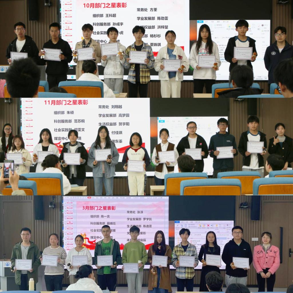 随后是本学年“部门之星”的颁奖环节,团委副书记赵非凡同学、主席团成员毕雨欣同学和赵苒婷同学为“部门之星”颁发荣誉证书与纪念礼物。