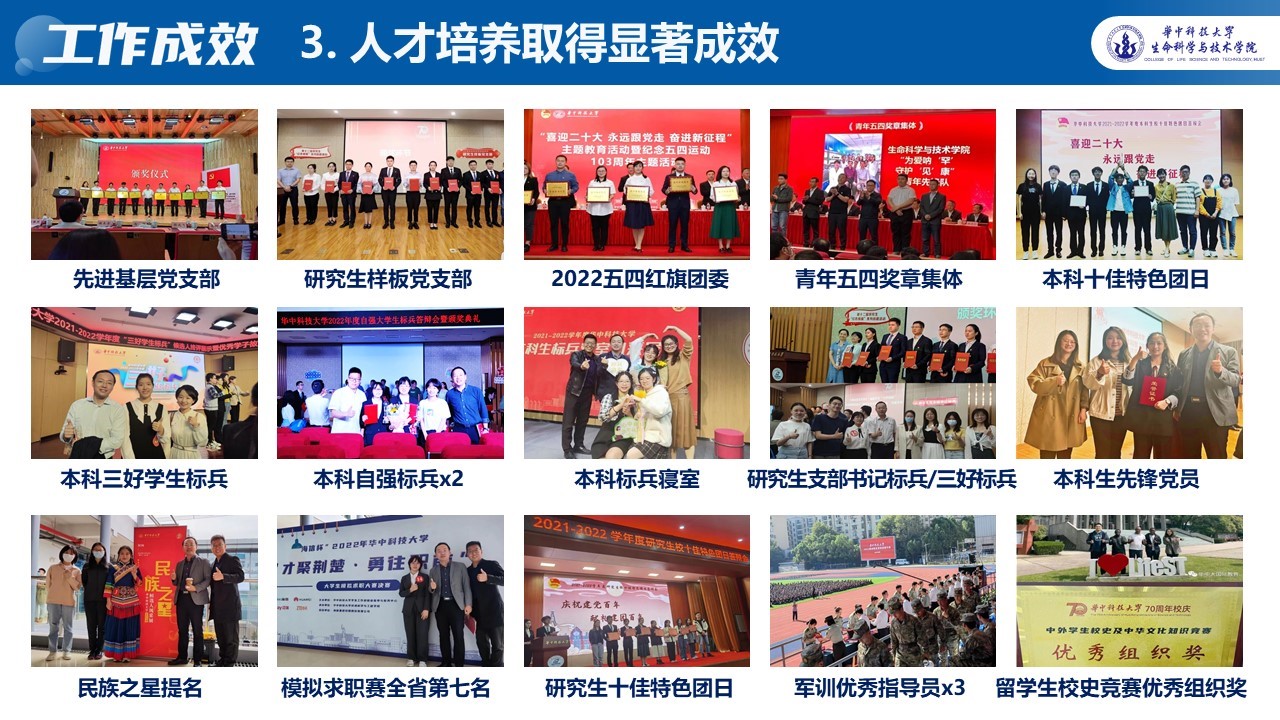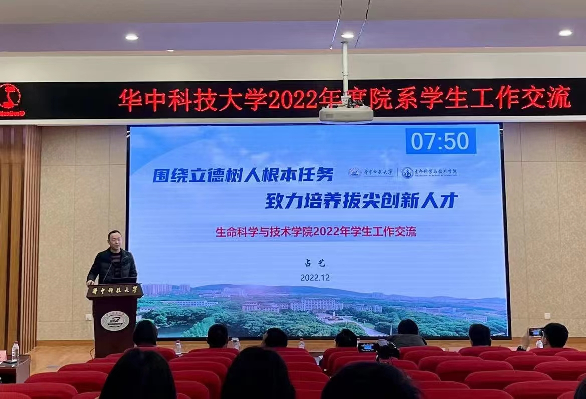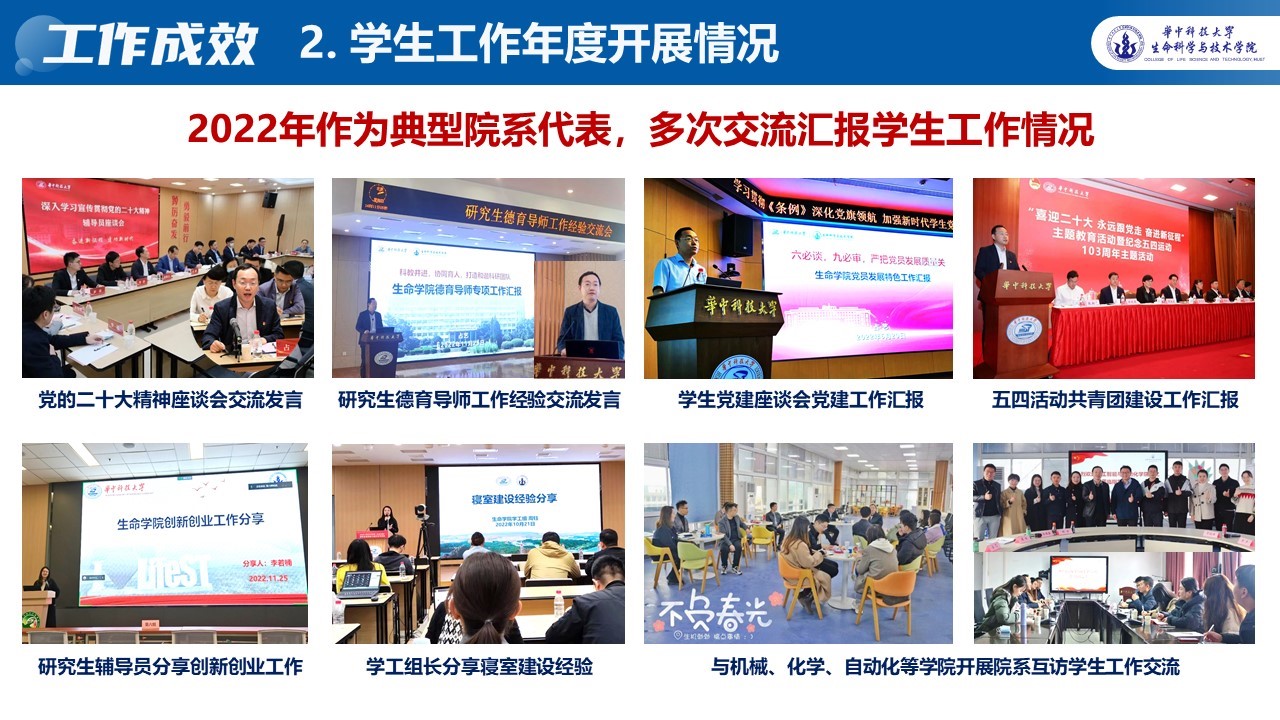 答辩现场,各单位学生工作负责人依次汇报交流,学工战线老师现场观摩。学院党委副书记占艺从特色工作、工作成效、新的思考等方面汇报了生命学院2022年度学生工作开展情况,以“创新、协调、绿色、开放、共享”开篇回顾去年的工作理念,通过优化学生党支部的体系、深化开放式的协同办学以及统筹本研一体双创教育分享了特色工作经验,就深入学习宣传贯彻党的二十大精神、深化“红色基因工程”纵深发展、推动学生工作高质量发展的思考谈到学院学生工作接下来的发展规划,最后期待年轻的学工队伍继续成长、携手并进。