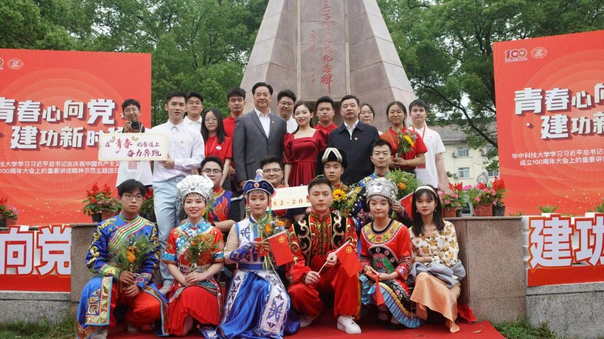 校党委书记李元元等和2022届研支团志愿者于建团一百周年庆祝活动合影