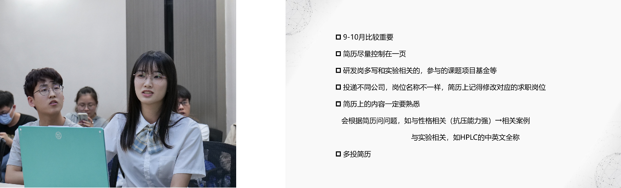 2020级生物化学与分子生物学硕士刘婉煜的就职去向是深圳新产业生物医学工程股份有限公司。刘婉煜向同学们介绍了求职过程中的几个关键时间点,并结合自己的经验,提醒同学们合理地展示自己所参与过的课题与项目内容,抓住面试官的眼球。她鼓励同学们多去参加面试,多复盘总结,多交流经验,做好心态建设,这样才更容易寻找到真正适合自己的工作,而当面试进程较多时,可以用表格辅助管理信息,防止时间冲突。