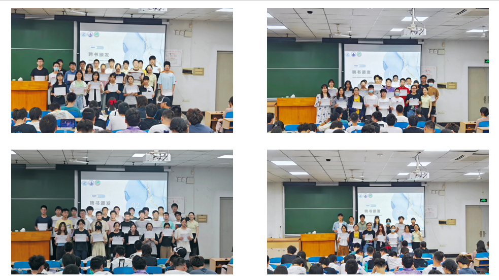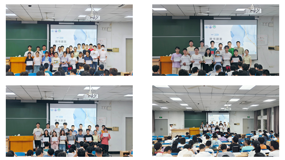 进入聘书颁发环节。班委们按照分工依次上台,由蒋老师颁发聘书,并拍照合影留念。班委聘书是对各位班委一学年来努力工作的证明和肯定,也是对未来学生工作的鼓舞与激励。