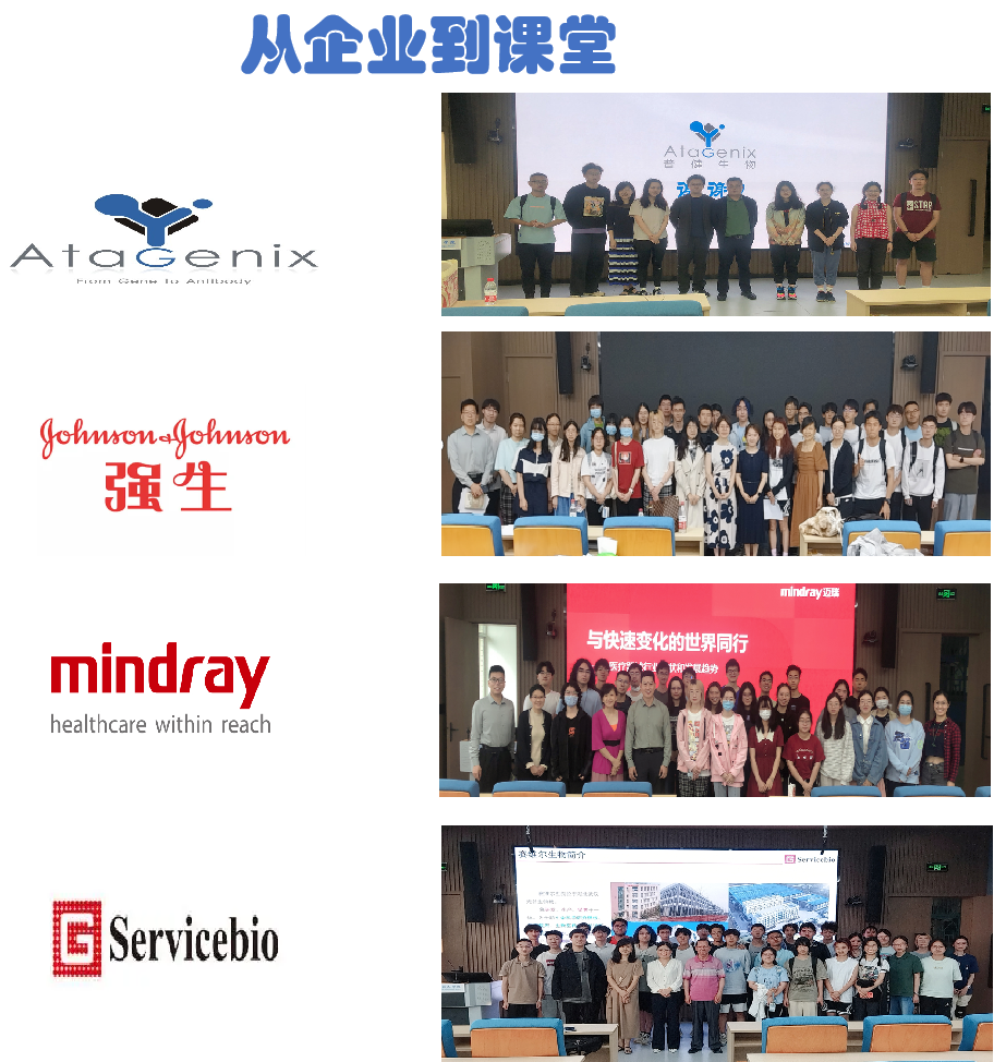 本次创新创业系列活动,分为两个篇章:第一篇章,从企业到课堂,邀请4家知名生物企业高管,走进课堂给同学们围绕生命科学在产业集群、学术科研等方面进行深度分享;第二篇章,从课堂到企业,带领同学们实地参观3家有代表性的生物企业,感受不同企业的快速发展。