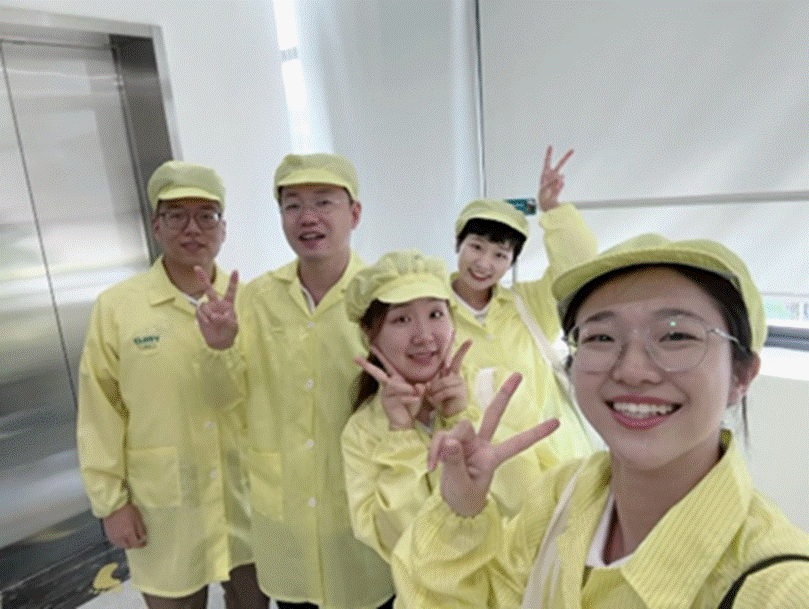 老师同学们身着防尘服准备进入生产一线参观