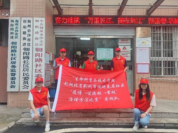 由生科2202班蒋俊杰等五位同学组成的 “调研基层社区‘疫情->过渡期->常规’治理方法之变”社会实践队,聚焦基层社区,关注基层社区工作者及居民,通过走访调查、实地观察等方法,对防疫成绩进行梳理总结,并与基层社区成员一道探索“疫情->过渡期->常规”治理方法之变。期间通过调研荆州市杨林堤路社区和朝阳路社区的遗留防疫标语、防疫设施和防疫空间,采访杨林堤路社区陈红艳书记、朝阳路社区江研书记、鲍关村村委会书记董诗群以及走访当地百姓,对整个荆州市的疫情防控政策变迁也有了较为宏观视角下的认识,同时也较为全面、细致地了解了基层工作者对于疫情防控工作的重要作用。