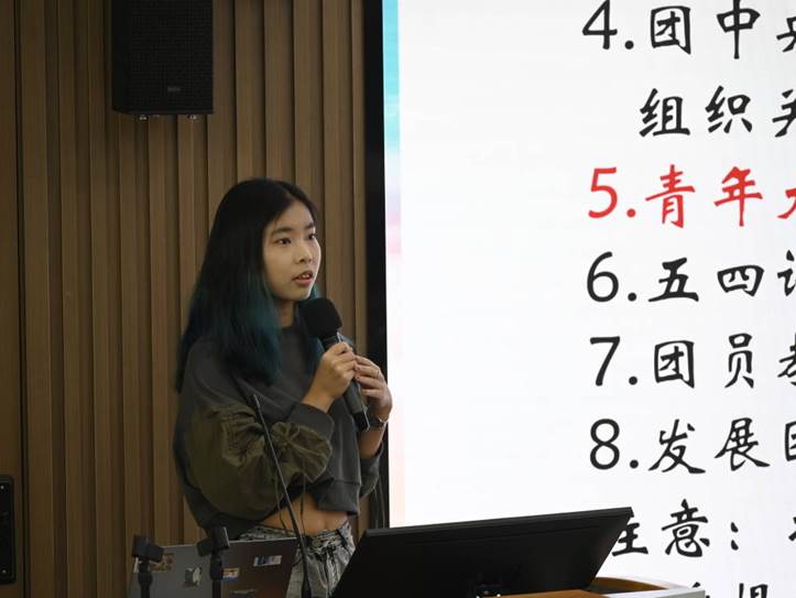 团务培训环节,团委组织部工作人员于昕扬详细讲解了基础团务、主题团日团课、特色团日等工作要求及近期事务。具体强调了基础团务工作要求、青年大学习开展注意事项、团日团课具体流程以及特色团日安排。最后,她结合自身一年的团务工作与全体团支书共勉“冀以尘雾之微,补益山海;萤烛末光,增辉日月”。