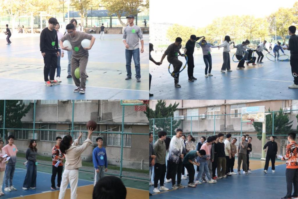 在主持人介绍完比赛流程与规则后,趣味运动会正式拉开序幕。 “五毛一块”的暖场游戏迅速拉近了师生之间的距离,在随后的团队赛环节,在场师生被分为4组,通过定点投篮、投沙包、“一圈到底”“摸石头过河”“大长腿”等比赛项目中展开激烈角逐。定点投篮和沙包项目中,队员们精准的投掷赢得了阵阵掌声与喝彩;“大长腿”项目充分展现了队员们的灵活性和协调性;“一圈到底”和“摸石头过河”项目中,团队成员相互协作、配合默契。