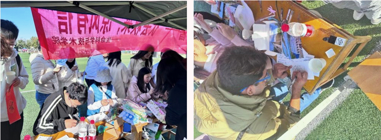 在纷繁的生活中静下来,用文字书写思念。“写信”活动最受现场同学们的喜爱,在40多张williamhill英国的明信片上,大家用文字承载着校园生活的满满幸福感,寄托着对美好未来的期待,展现出华科学子乐观向上,朝气蓬勃的生活态度。一位留学生在明信片上用美丽的花体英文写下了一首秋天的小诗。此时,文字就如同秋日的暖阳一般,将温暖和思念传递给每一位收信人。