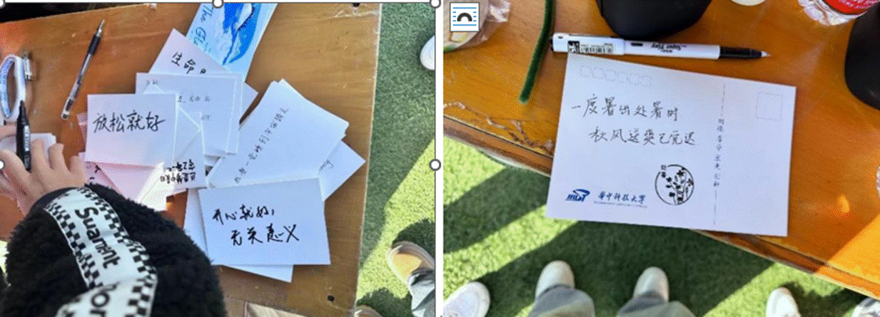 处暑时节,古人有放河灯、煎药茶的传统习俗。以此为灵感,生命学院心理服务中心设计了三项趣味活动——制作简易河灯、品尝药茶、以信传情寄思念。河灯虽简,寄托的思念浓郁;药茶虽非亲手煎制,但热气仍氤氲着千年传承。另外,基于“处暑”这一节气处于夏秋交替之际的诗意属性,创意性地设置了“书信寄思念”环节,以信寄请,传递温暖,在凉风习习的深秋,它可以传递学子们的思念与关怀。