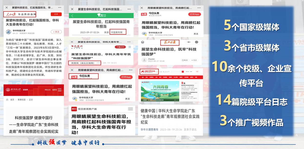 实践队形成《企业走访实录合集》13篇、《生命科学技术报告》13篇、《生命校友访谈合集》14篇、《实践纪实合集》40余段等文字材料,社会实践成果被中国青年网、中国大学生网报、人民号、头条号、企鹅号等国家级媒体报道,被湖北日报、楚天都市报、长江头条等省市级媒体报道,被10余个校级、企业等宣传平台报道,形成3个推广视频作品。