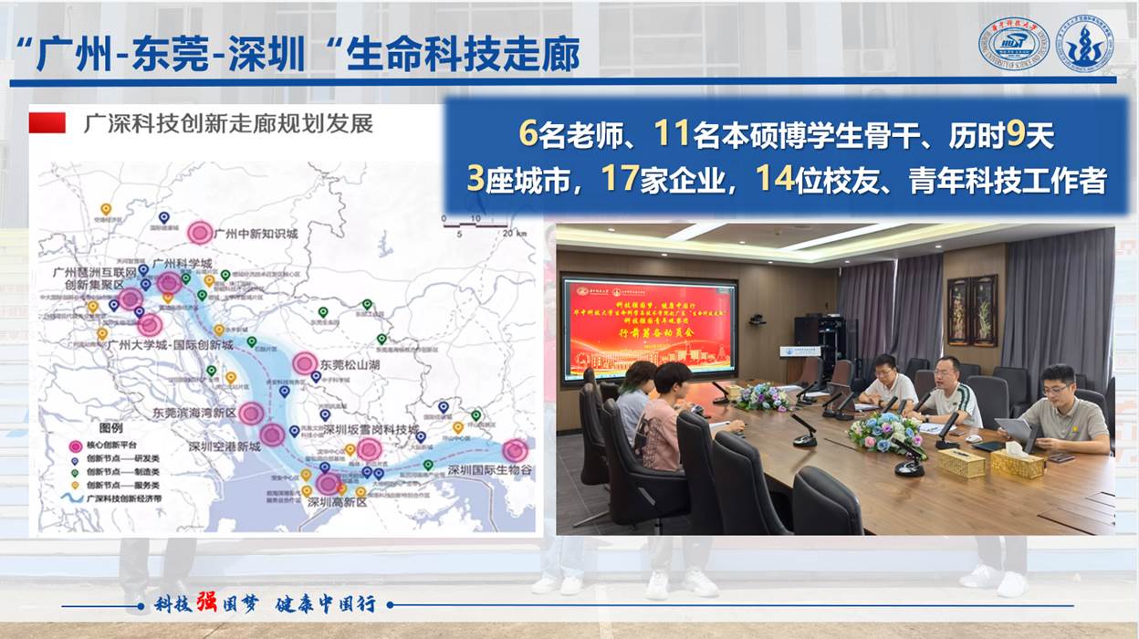 为响应“健康中国”“科技强国”国家战略,深入贯彻党的二十大精神,强化教育、科技、人才“三位一体”发展理念,2023年8月3日至9日,生命学院党委副书记带队,5名辅导员、11名本硕博学生,赴广州、东莞、深圳3地,历时7天,走访17家生命科技企事业单位,开展以“科技强国梦·健康中国行”为主题的科技强国青年观察团社会实践。师生调研前沿生命科技产业,访谈杰出生命校友,搭建校企合作桥梁,传递科学家精神,访企拓岗拓宽资源,推进校企合作各项事业共同发展。