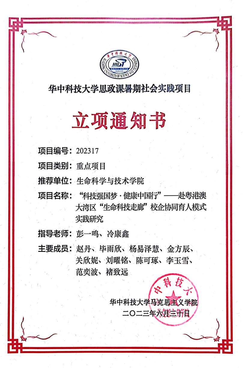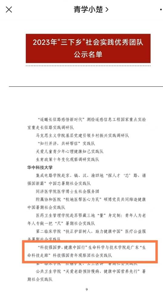 近日,为推进“三下乡”实践活动持续深入开展,充分发挥共青团组织在实践育人中的重要作用,经基层申报、各地各单位团组织推荐、组织评议等环节,团省委、省学联决定,对2023年“三下乡”活动中表现突出的单位、项目、团队、个人给予通报表扬。生命学院“科技强国梦,健康中国行”赴广东“生命科技走廊”科技强国青年观察团社会实践队荣获湖北省2023年“三下乡”社会实践优秀团队!