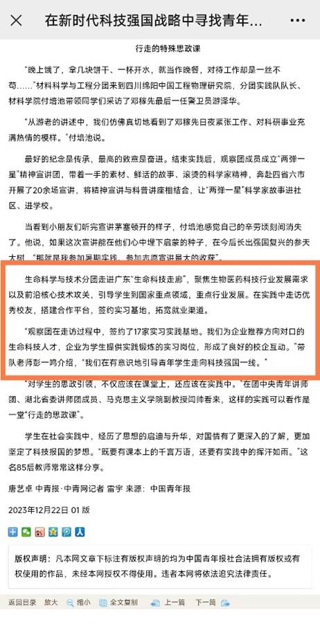 同时生命学院这支实践队的故事作为williamhill英国团委“科技强国青年观察团”的组成部分,被《中国青年报》报道。该社会实践团队也获得“williamhill英国思政课暑期社会实践项目”重点项目立项支持!