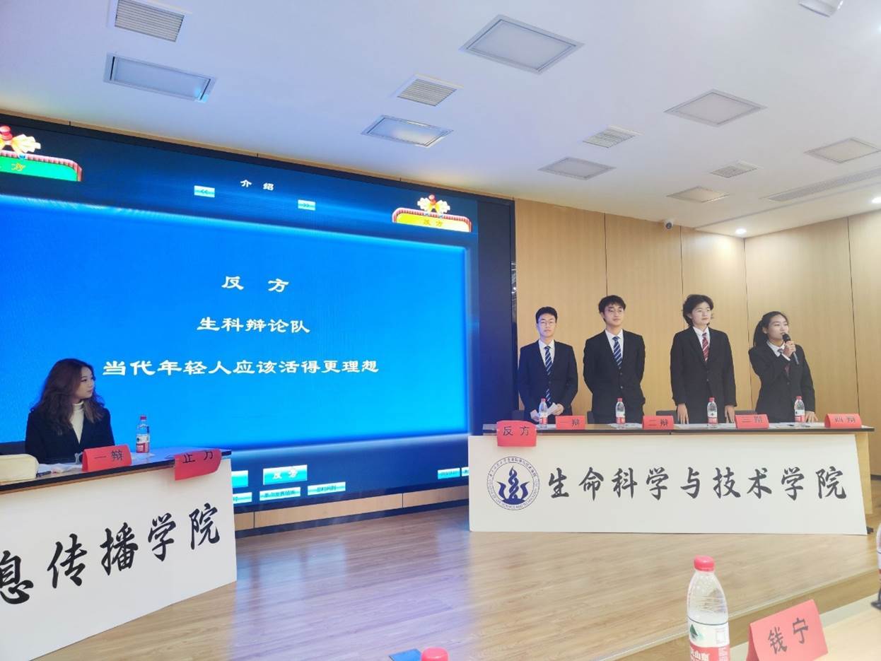 此次新生杯辩论赛决赛的辩题是“当代年轻人应该活得更现实/更理想”。生科辩论队为反方,所持观点是“当代年轻人应该活得更理想”,对手为新闻学院辩论队。团委书记彭一鸣老师特别莅临决赛现场,为辩论队的队员们加油助威。