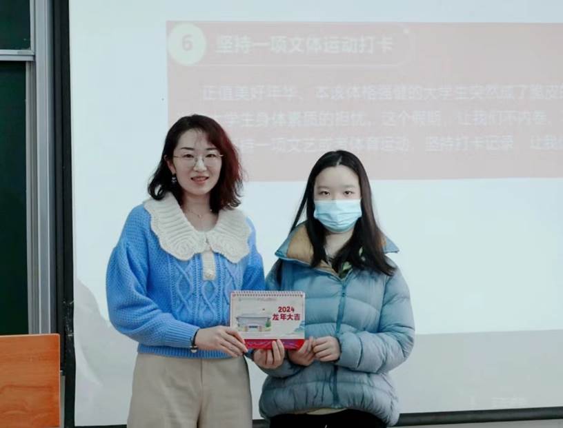 李镀锋回顾和总结了寒假作业“六个一”,在进行安全主题海报设计作品分享时,她同时播放了校园安全主题教育视频,希望同学们针对电动车使用注意事项等校园安全问题重视起来,对完成优秀的同学给予生命学院文创台历表示奖励。