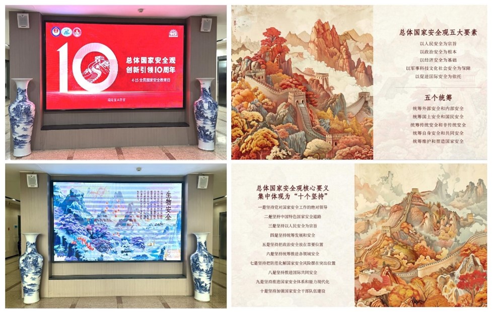 学院一楼大厅全天循环播放来自“国安宣工作室”发布的权威宣传海报,引导全体师生系统学习总体国家安全观所涉及的5大要素、5个统筹、10个坚持和20个重点安全领域,牢固国家安全意识。